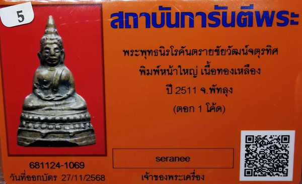 พระพุทธนิรโรคันตรายชัยวัฒน์จตุรทิศ พิมพ์หน้าใหญ่ เนื้อทองเหลือง ปี2511 จ.พัทลุง(ตอก1โค้ด) + บัตรG-pra สภาพเดิมค่ะ |
