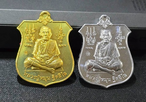 2 องค์ . สภาพสวย . เท่าไหร่เท่านั้น ... เหรียญมหาสำเร็จ หลวงปู่หมุน หลังพระพิฆเนศ เนื้อตะกั่ว+เนื้อทองเหลือง วัดบ้านจาน ปี 60 + กล่องเดิม |