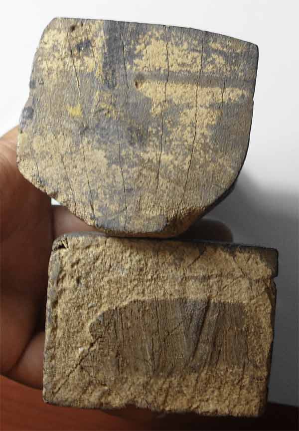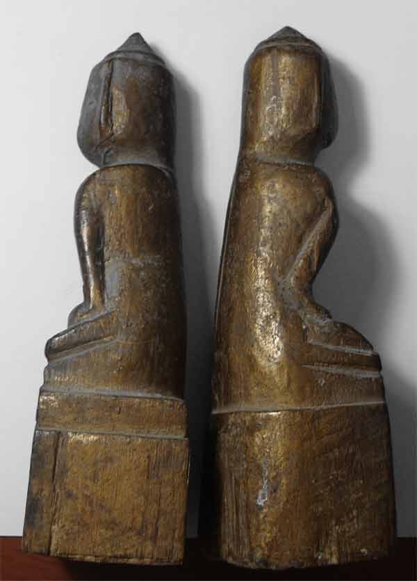 พระไม้ ทาทอง ศิลป์ชาวบ้าน 2 องค์ ขนาดฐาน 2.5 นิ้ว หน้าตัก 2 นิ้ว สูง 7.5 นิ้ว แกะจากไม้ เก่ามีอายุ เป็นสิบยี่สิบปีขึ้นไป มี1. พิมพ์ สมาธิ 2. พิมพ์สดุงมาร (สดุงกลับ กลับร้ายให้กลายเป็นดี ตามคติความเชื่อของคนโบราณ) |