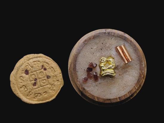 พญายูงคำ รุ่นแรก เนื้อมวลสารเก่าครุบาออปัดทอง และตลับไม้สีผึ้งเนื้อหอม รังผึ้งร้าง ขวางเดือนขวางตะวัน รุ่นแรก ฝังอิ่น ตะกรุด ในเมตตาบารมี เจ้าปู่จั่นต่า กาวิสาละ ครูบากฤษดา เมตตาเษก