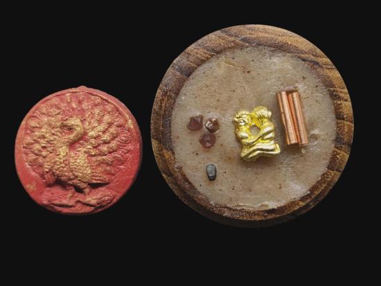 พญายูงคำ รุ่นแรก เนื้อแดงปัดทอง และ ตลับไม้สีผึ้งเนื้อหอม รังผึ้งร้าง ขวางเดือนขวางตะวัน รุ่นแรก ฝังอิ่น ตะกรุด ในเมตตาบารมี เจ้าปู่จั่นต่า กาวิสาละ พญานกยูง ขนาดเท่าเหรียญสิบบาท