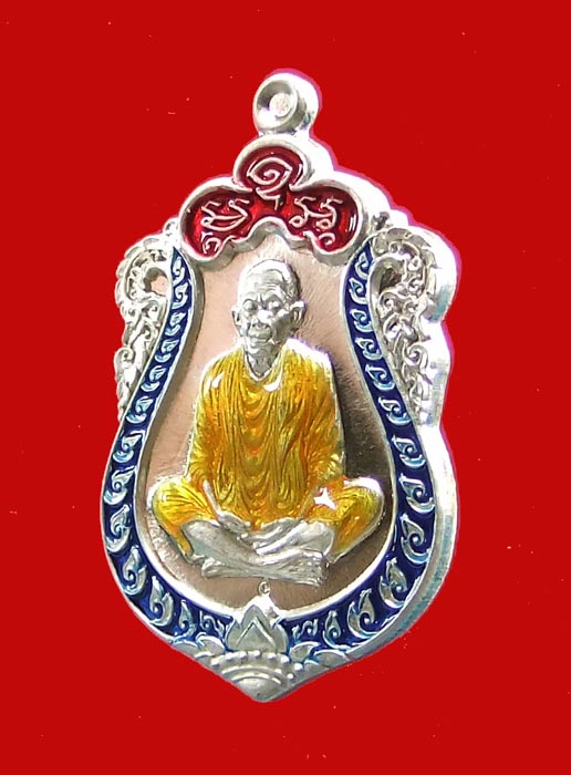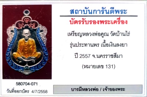 หลวงพ่อคูณ เสมาประทานพร เนื้อเงินลงงยา 3 สี แยกจากชุดกรรมการ หมายเลข ๑๓๑ พร้อมบัตรรับรอง |