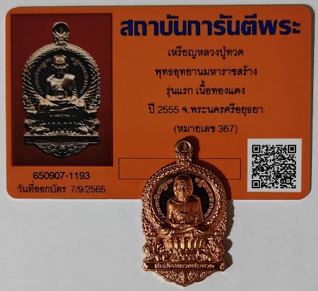 เหรียญหลวงปู่ทวด เนื้อทองแดง ปี 2555 รุ่นแรก พุทธอุทยานมหาราชสร้าง จ.พระนครศรีอยุธยา "หมายเลข 367" พิธีใหญ่ สภาพสวย ไม่ผ่านการใช้งาน พร้อมบัตรรับรองพระแท้ |