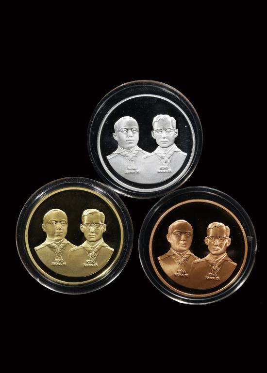 เหรียญร.6-ร.9 ที่ระลึกงานชุมนุมลูกเสือโลกครั้งที่ 20 ปี2546 (((เนื้อเงิน + ทองชุบ + ทองแดง ขัดเงา))) เก่าเก็บ ไม่ผ่านใช้ สภาพสวย มีกล่องใน