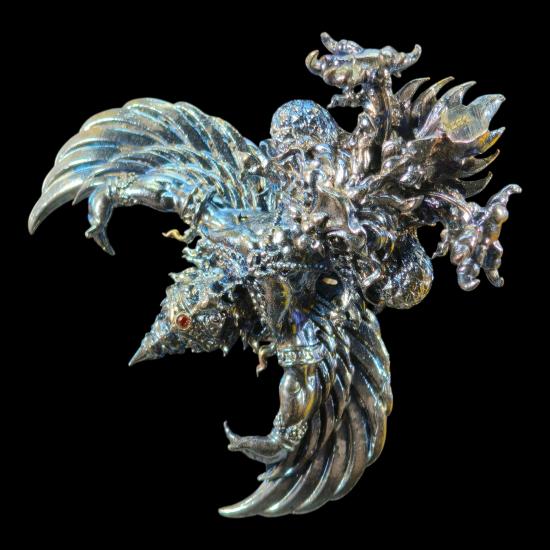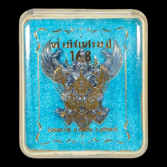 พญาครุฑ ผู้ทรงอิทธิฤิทธิ์ทั่วหล้า ปฐมบทแห่งครุฑ รุ่นคัมภีร์เศรษฐี 168 วัดหนองไผ่ อ.ทับทัน จ.อุทัยธานี เนื้อมหาชนวนเจ้าน้ำเงิน บุศราคัม หมายเลข ๒๘๑ พร้อมกล่องเดิม พิมพ์ใหญ่ ขนาดสูง 4 ซม. |