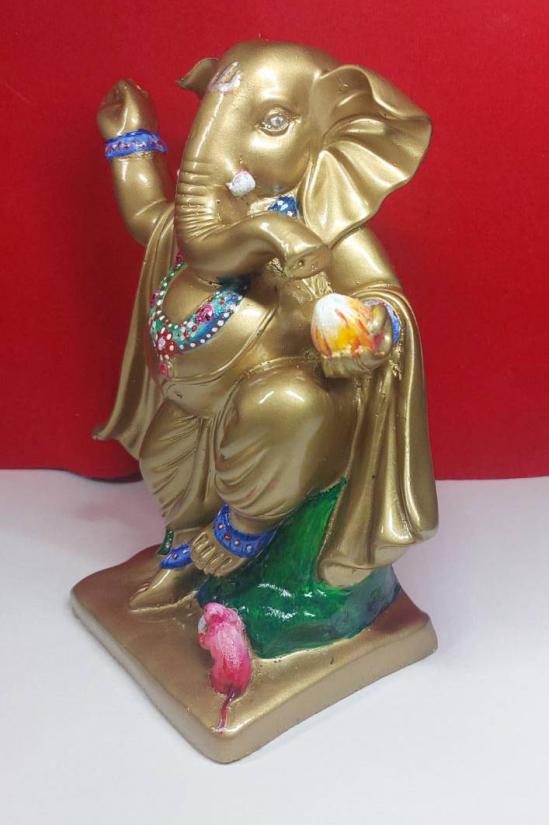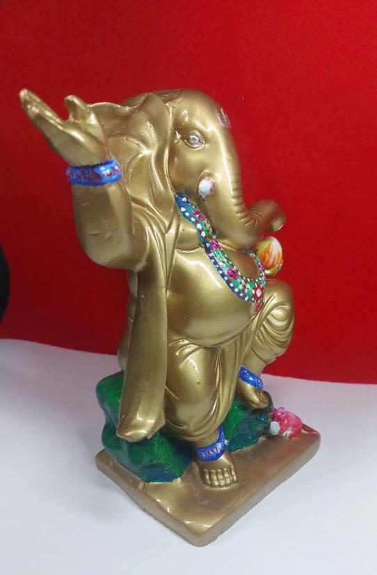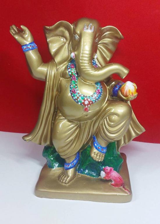 รายละเอียด พระคเณศวรปางลีลาร่ายรำ ขนาดสูง 7 นิ้ว ถือขนมโมทกะเพื่อประทานความร่ำรวย เนื้อเรซิ่นเพ็นสี