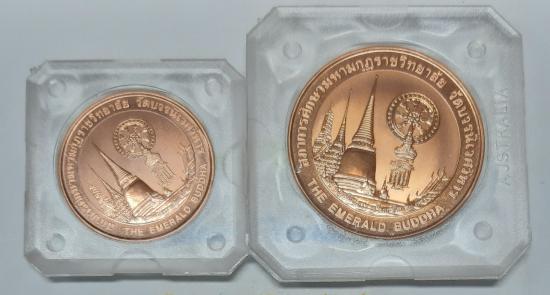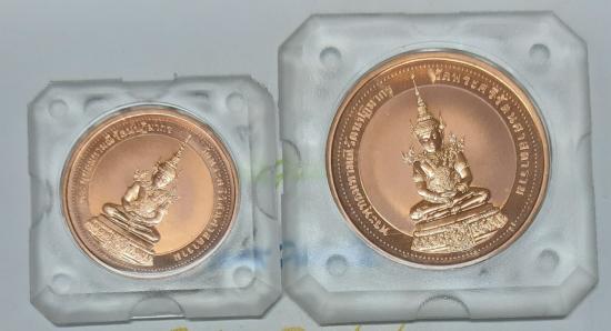 เหรียญพระพุทธมหามณีรัตนปฏิมากร พระแก้วมรกต สภามหามงกุฏราชวิทยาลัย วัดบวรนิเวศวิหาร เนื้อทองแดง พิมพ์เล็ก และพิมพ์ใหญ่ 2 เหรียญ