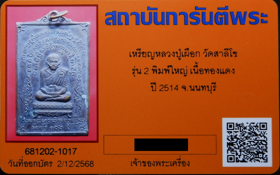 เหรียญหลวงปู่เผือก วัดสาลีโข (พิธี 4 มหาจักร) เนื้อทองแดงรมดำ รุ่น2 ปี2514 พิมพ์ใหญ่ + บัตรรับรอง G-PRA