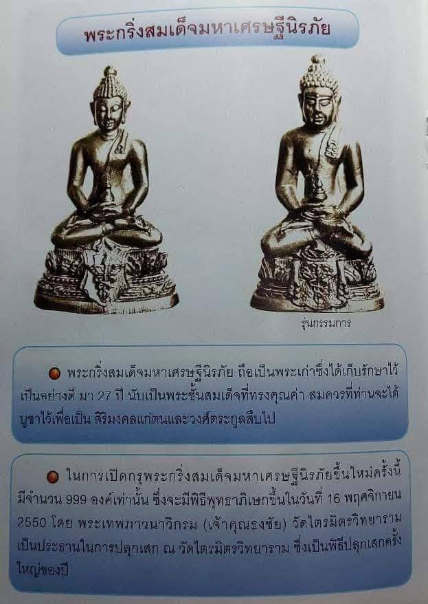 พระกริ่งสมเด็จมหาเศรษฐีนิรภัย มีประวัติการจัดสร้างอย่างสมบูรณ์ด้วยพิธีกรรม ได้รับพระมหากรุณาธิคุณจากสมเด็จพระสังฆราช พระอริยวงศาคตญาณ (วาสนมหาเถร)