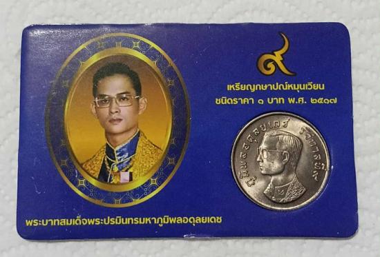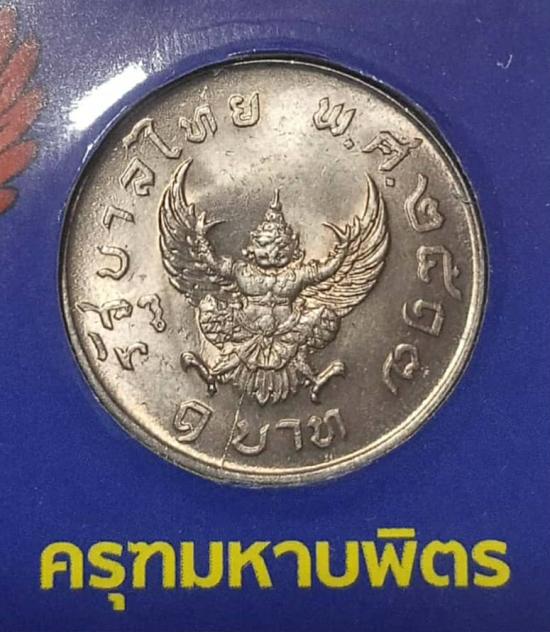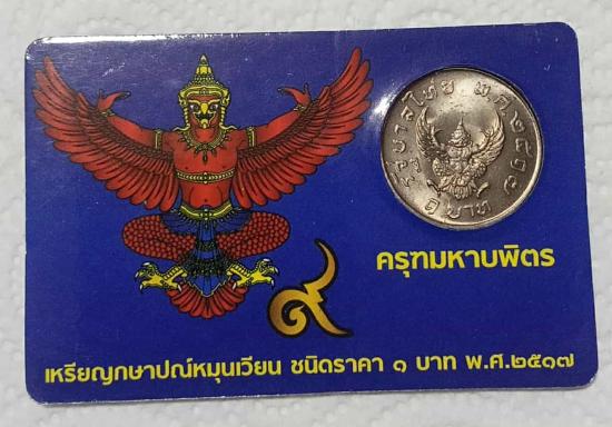 เหรียญ 1 บาท หลังครุฑ พ.ศ.2517 ในสมัยรัชกาลที่ 9 พร้อมการ์ดสีน้ำเงินพกติดตัวไว้เป็นมงคล เหรียญสภาพไม่ผ่านการใช้งาน ผิวเดิมสวย จำนวน 1 เหรียญ ครับ ((บล็อคเนื้อเกินเป็นเส้นตรงตั้งแต่ตรงลำตัวถึงขอบเหรียญ |