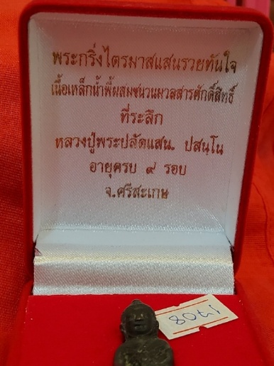 พระกริ่งไตรมาสแสนรวยทันใจ เนื้อเหล็กน้ำพี้ผสมชนวนมวลสารศักดิ์สิทธิ์ หลวงปู่แสน ปสโน วัดบ้านหนองจิก จ.ศรีสะเกษ อายุครบ ๙ รอบ ปี ๕๙ หมายเลข ๑๗๐๘