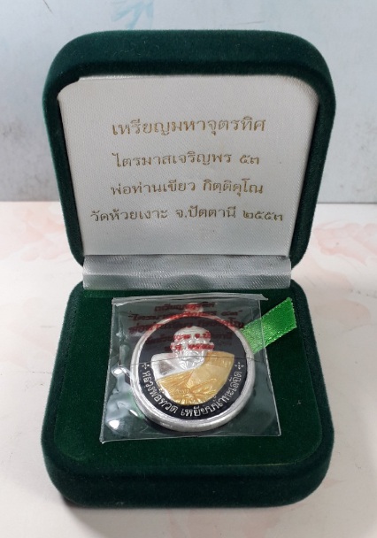 เหรียญมหาจตุรทิศ ไตรมาสเจริญพร ๕๓ พ่อท่านเขียว วัดห้วยเงาะ จ.ปัตตานี ปี2553 เนื้อเงินลงยาสีดำ มีโค๊ดหน้า-หลัง หมายเลข#๔๒ แยกจากชุดกรรมการ พร้อมกล่องกำมะหยี่เดิม