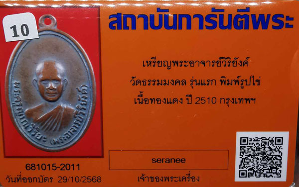 เหรียญพระอาจารย์วิริยังค์ วัดธรรมมงคล รุ่นแรก พิมพ์รูปไข่ เนื้อทองแดง ปี2510 กรุงเทพฯ + บัตรG-pra สภาพเดิมค่ะ สภาพตามรูปทุกประการค่ะ