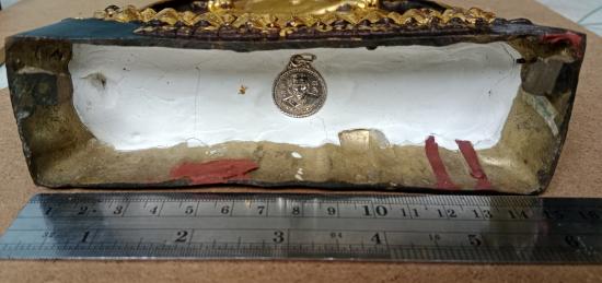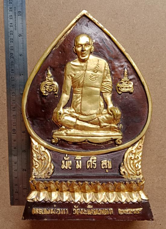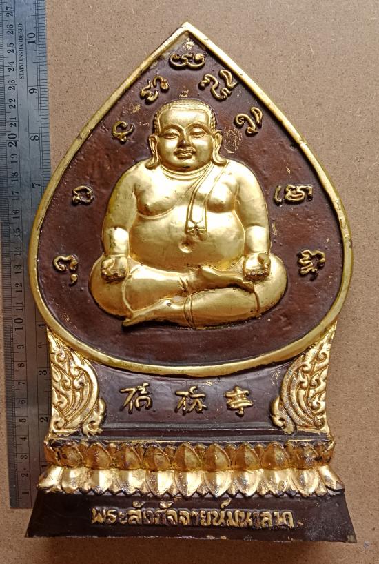 พระบูชาขนาดใหญ่ มั่ง มี ศรี สุข หลวงพ่อทาวัดพะเนียงแตก ปี2539 เนื้อโลหะ ลงทอง ความสูง 10 นิ้ว ความกว้าง 6 นิ้ว สองหน้า หลวงพ่อทา+พระสังกัจจายน์ ใต้ฐานฝังเหรียญ ตามรูป