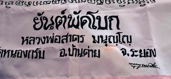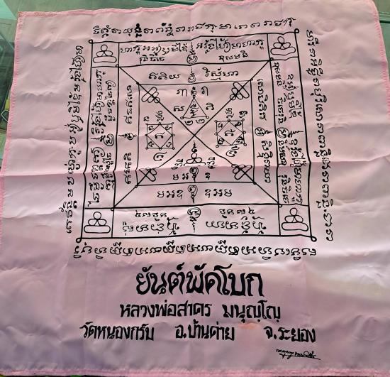 ผ้ายันต์พัดโบก ปี 2538 หลวงพ่อสาคร วัดหนองกรับ จังหวัดระยอง (สีชมพู) สวย ขนาด 22x22นิ้ว |