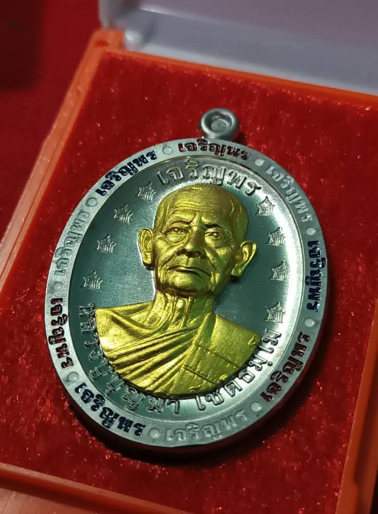 เหรียญเจริญพร7รอบ หลวงปู่บุญมา ตะกั่วหลังเรียบ หน้ากากทองทิพย์ ฝังตะกรุด1ดอก No.122 |