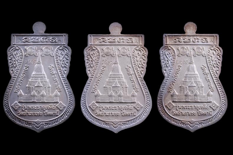 -จำนวน 3 เหรียญ เหรียญหลวงปู่ทวด อาจารย์ทอง วัดสำเภาเชย พิมพ์พุทธซ้อน รุ่นพระธาตุเจดีย์ เนื้อเงินลงยาลายธงชาติ ปี 2549 จ.ปัตตานี