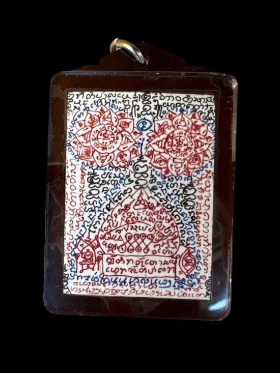 ด้านหลังมี ผ้ายันต์เขียนมือสีแดงน้ำเงิน ลายโบราณ