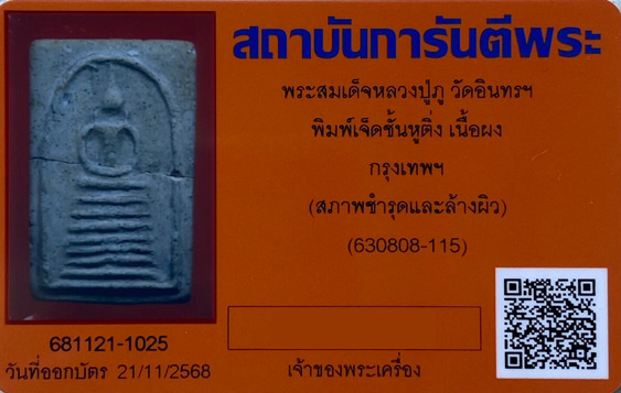 พระสมเด็จ หลวงปู่ภู วัดอินทร์ฯ พิมพ์ 7ชั้น หูติ่ง เนื้อจัดหนึกนุ่ม พร้อมบัตรรับรอง G