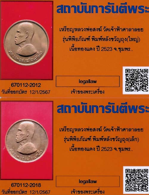 3.บัตรรับรองพระแท้จากสถาบันการันตรีพระ สถาบันออกบัตรรับรองพระแท้อันดับ 1 ของประเทศ มูลค่าใบละ 700 บาท 2 ใบ รวมมูลค่า 1,400 บาท