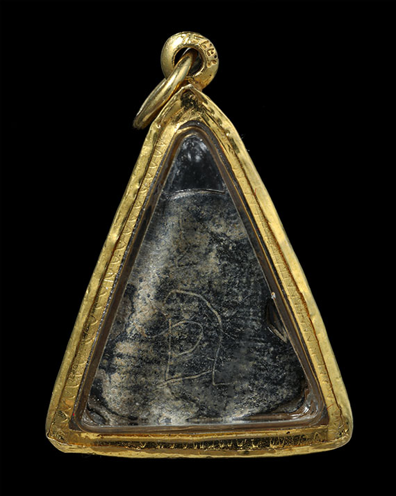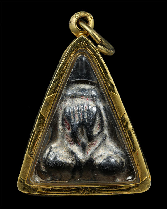 พระปิดตาหลวงปู่เอี่ยม วัดหนัง กรุวัดนางชี กทม. ปี 2430-2469 พิมพ์นะหัวเข่าเล็ก (พิมพ์ต้อ) เนื้อชินตะกั่ว (เลี่ยมทอง) |
