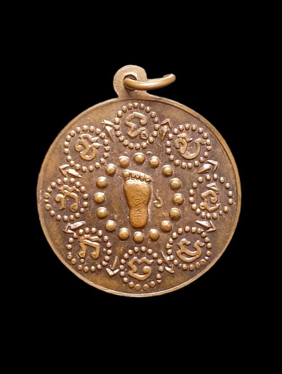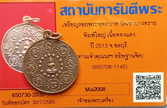 เหรียญรอยพระพุทธบาท วัดเขาบางทราย พิมพ์ใหญ่ เนื้อทองแดง ปี2513 จ.ชลบุรี (ท่านเจ้าคุณนรฯ อธิษฐานจิต) พร้อมบัตรรับรอง
