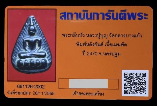 พระกลีบบัวหลวงปู่บุญ เนื้อเมฆพัตร พิมพ์หลังข้าวหลามตัด สร้างราว ปี2470 พระชุดนี้เป็นพระพิมพ์มาตราฐาน เนื้อเมฆพัตรของหลวงปู่บุญ วัดกลางบางแก้ว เล่นหาไม่สับสน พิมพ์นี้ด้านหลังจะมีหลายแบบ แต่แบบที่เห็นใน |