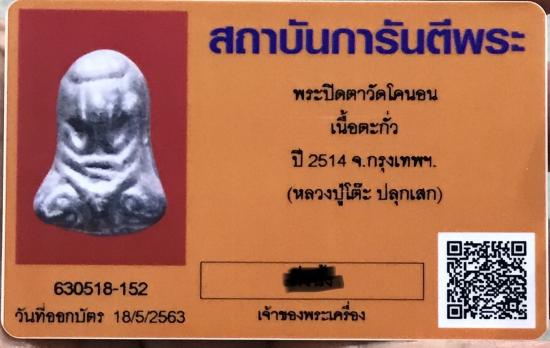 พระปิดตาวัดโคนอน จ.กรุงเทพฯ เนื้อตะกั่ว ปี 2514 พร้อมบัตรรับรอง สวยครับ |