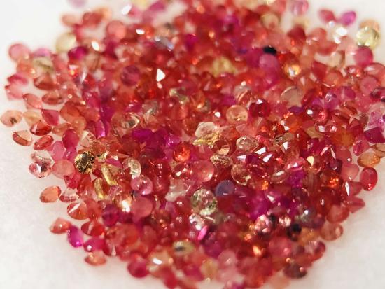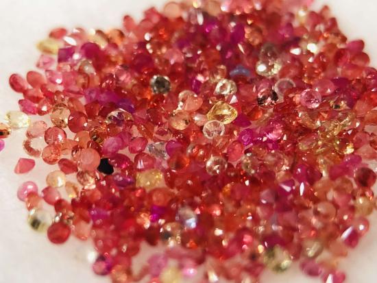 แฟนซีแซฟไฟร์ 3 กะรัต ไซส์ ขนาด 1.0 มิล (เทียบเพชรไซส์ครึ่งตัง) ~450 เม็ด ( ทับทิม ไพลิน เขียวส่อง บุษราคัม พัดพารัชชา เรดแซฟไฟร์ ออร์เรนแซฟไฟร์ กรีนแซฟไฟร์) เจียระไนเหลี่ยมเพชร |