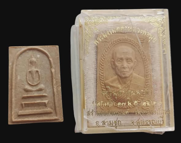 หลวงพ่อขอม วัดไผ่โรงวัว ฯลฯ + พระผงรูปเหมือนหลวงพ่อมุ่ย วัดดอนไร่ พิธียกช่อฟ้าอุโบสถวัดหนองบัวทอง ปี 2521 จ.สุพรรณบุรี เนื้อผงน้ำมัน สภาพสวยสมบูรณ์ มีกล่องเดิมครับ กล่องมีแตกชำรุดตามภาพ |