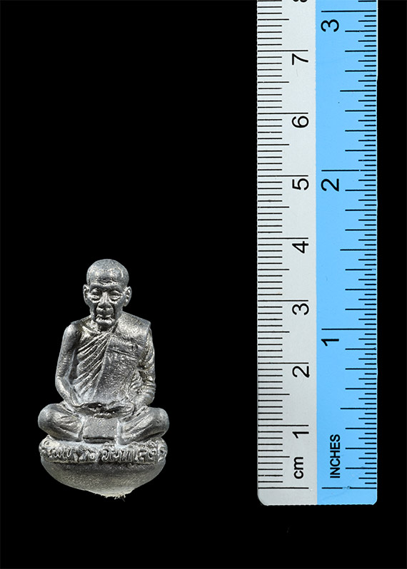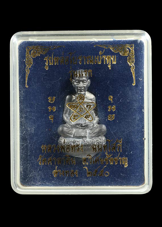 รูปหล่อโบราณเบ้าทุบ รุ่นแรก หลวงพ่อทรง ฉนทฺโสภี วัดศาลาดิน จ.อ่างทอง พ.ศ.2550 เนื้อตะกั่ว ตอกโค๊ต ตอกเลข พร้อมกล่องเดิม |