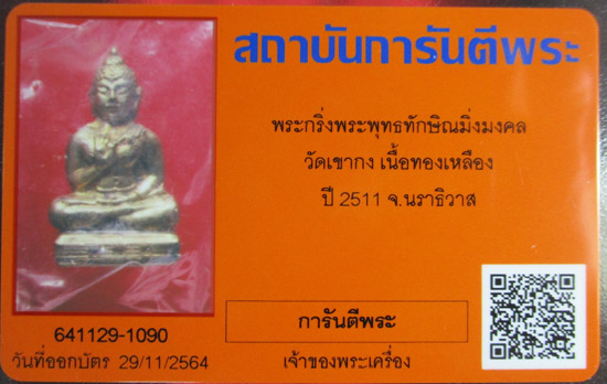 พระกริ่งพระพุทธทักษินมิ่งมงคล วัดเขากง เนื้อทองเหลือง จ.นราธิวาส ปี 2511 พร้อมบัตรรับรอง