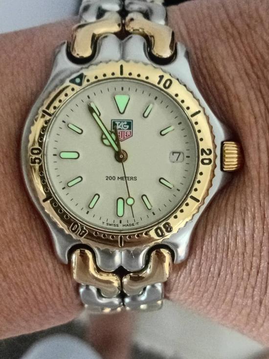 tag heuer S95 713M/E ขนาด boy size ขนาดประมาณ 37 รวมเม็ด สายยาวประมาณ 20 ซม สภาพสายใหม่ มือ 2 ไม่มีรอยผุ ระบบถ่าน ใช้งานปกติ หน้าปัด สีครีม สวยเดิม พรายน้ำชัดมาก สภาพเดิมทั้งหมด
