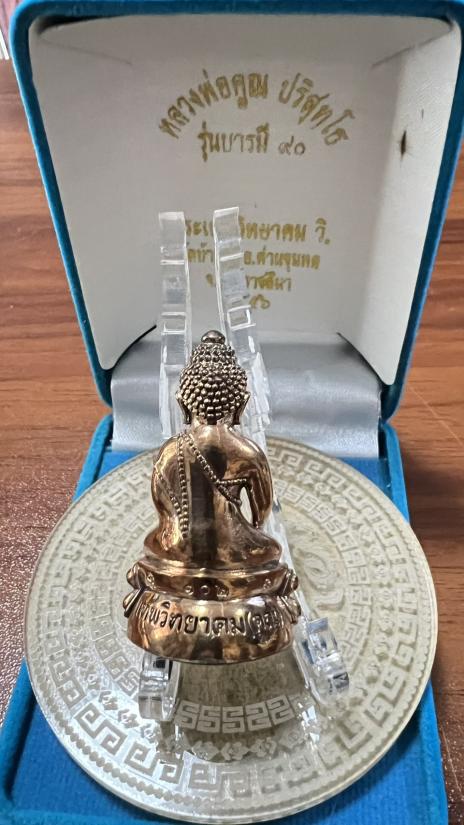 พระกริ่งหลวงพ่อคูณรุ่นบารมี 90 เนื้อนวะโลหะสีพิ้งค์โกลด์ สภาพสวยเดิมมีกล่องกำมะหยี่หมายเลข 102 |