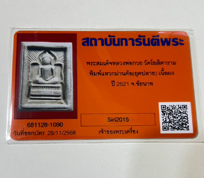 พระสมเด็จแหวกม่านหลวงพ่อกวย ปี 2521 เนื้อผง พิมพ์ต้อ วัดโฆสิตาราม จ.ชัยนาท ออกบัตรแล้วเรียบร้อย