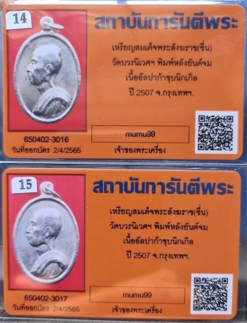 เหรียญสมเด็จฯพระสังฆราชชื่น (กรมหลวงวชิรญาณวงศ์) เนื้ออัลปาก้า พ.ศ.2507 พระองค์ทรงเป็นองค์พระอุปัชฌาย์ในพระบาทสมเด็จฯพระเจ้าอยู่หัว ร.9 ครั้งทรงออกผนวช จน.2เหรียญ พร้อมบัตรรับรองทั้ง 2 เหรียญ เหรียญนี้แม้ไม่ทันพระองค์ท่าน แต่ก็จัดเป็นเหรียญที่ระลึกที่ทรงคุณค่า ในทางประวัติศาสตร์และพระราชพิธี โดยพระบาทสมเด็จฯพระเจ้าอยู่หัว ทรงเสด็จฯในพิธี วันที่ ๘ มกราคม ๒๕๐๗ และพิธีสงฆ์ยิ่งใหญ่ พระคณาจารย์ร่วมในพิธี อาทิ