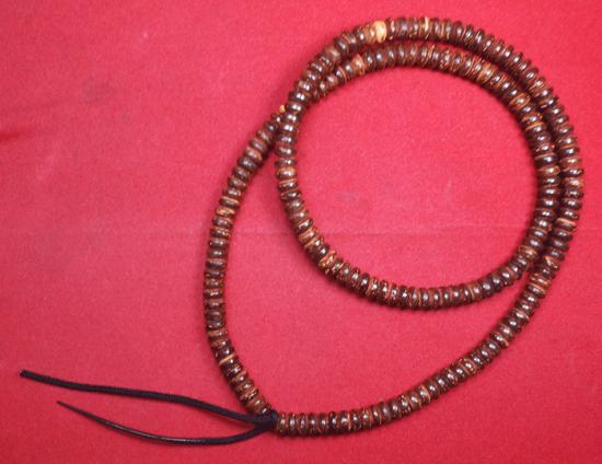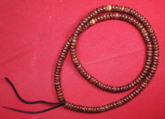 สร้อยเม็ดกะลาผสมเม็ดกะลาตาเดียว ขนาดเส้นผ่าศูนย์กลาง 8.5 ม.ม.หนา 3 ม.ม.จำนวนประมาณ 190 เม็ด ความยาว 13.5 นิ้ว |