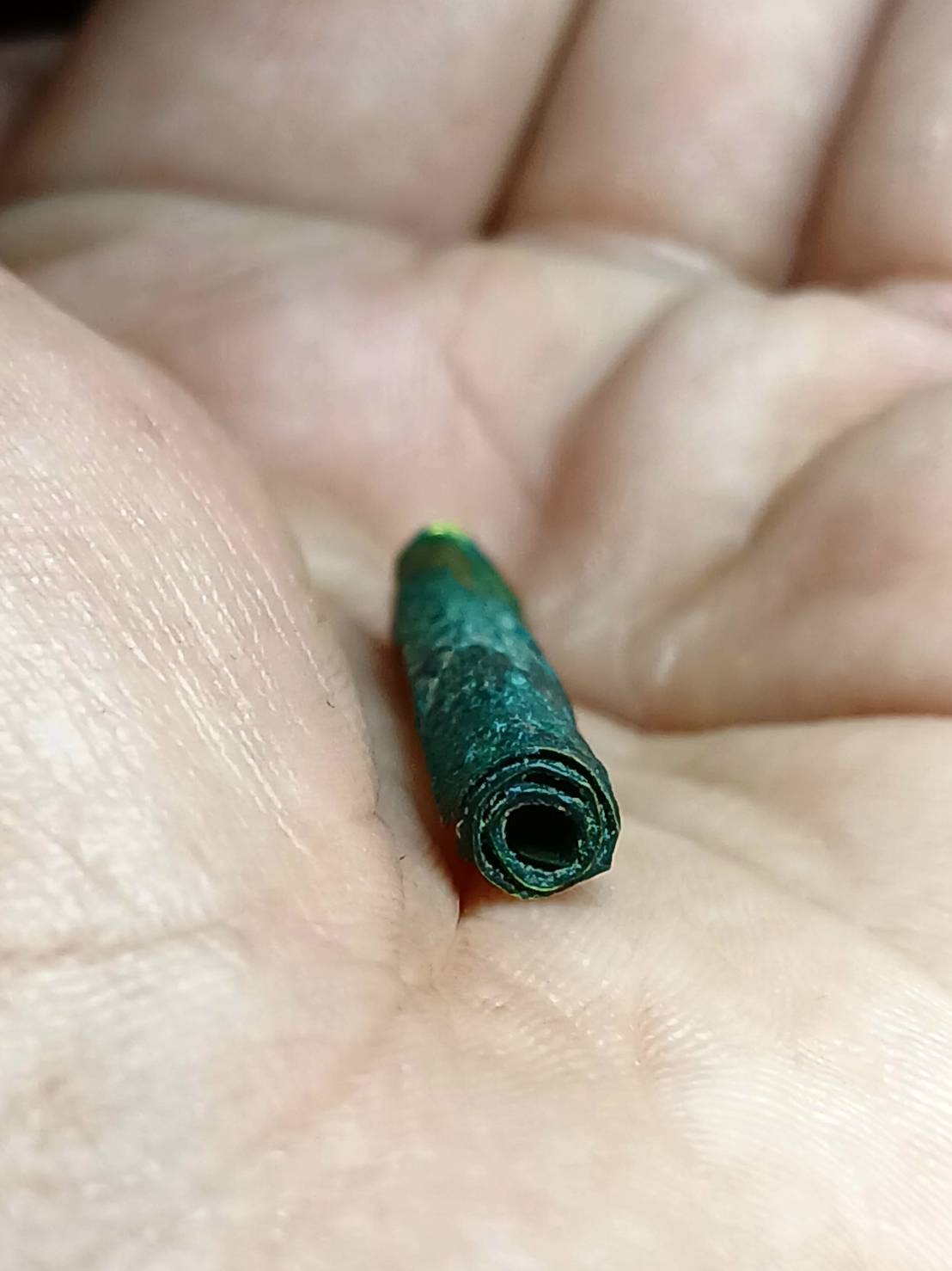 รายละเอียด ตะกรุดสาริกาสีผึ้งเขียว เนื้อทองเหลือง หลวงพ่อทาบ วัดกระบกขึ้นผึ้ง จ.ระยอง +เลี่ยมปลอกพร้อมใช้