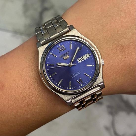 classic seiko 5 น้ำเงิน ... หลังโชว์กลไก ... มือสองวินเทจ สภาพสวย (ทรงคล้าย tissot prx เท่ๆ เลย)