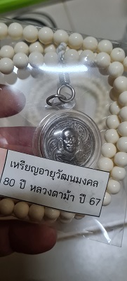 เหรียญอายุวัฒนมงคล 80 ปี เนื้อตะกั่ว(มีค่าดั่งทองคำ)หลวงตาม้า วัดถ้ำเมืองนะ พร้อมรอยจารหลวงตาม้า เลี่ยมจากวัดพร้อมประคำ