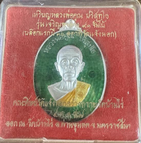เหรียญ หลวงพ่อคูณ ปริสุทฺโธ เหรียญจัมโบ้รุ่นเจริญพรล่าง91 เนื้อเงินลงยาสีเขียว หมายเลข95 มีกล่องครับ(น้ำหนักเงิน36.5กรัม)