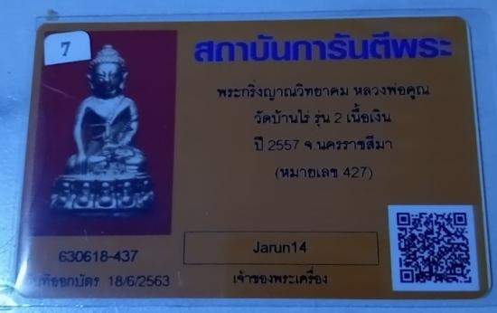 พระกริ่งญาณวิทยาคม หลวงพ่อคูณ วัดบ้านไร่ รุ่น 2 เนื้อเงิน ปี 2557 จ.นครราชสีมา (หมายเลข 427) |