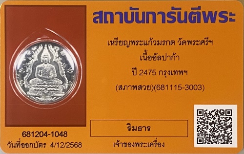เหรียญพระแก้วมรกต เนื้ออัลปาก้า ปี2475 (สภาพสวย) มีบัตรรับรองจีพระ เคาะเดียว