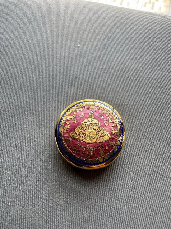 เคาะเดียวไวไว ตลับสีผึ้งพระราหู มหานิยมอุดมโชค จตุคามรามเทพ รุ่น มงคลจักรวาล ปี2549 พิมพ์เล็ก ขนาด3.2ซม ลงยาแดง ลงเบญจรงค์น้ำทอง สีผึ้งด้านในเดิมๆ |