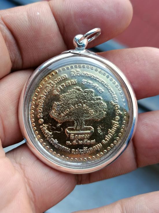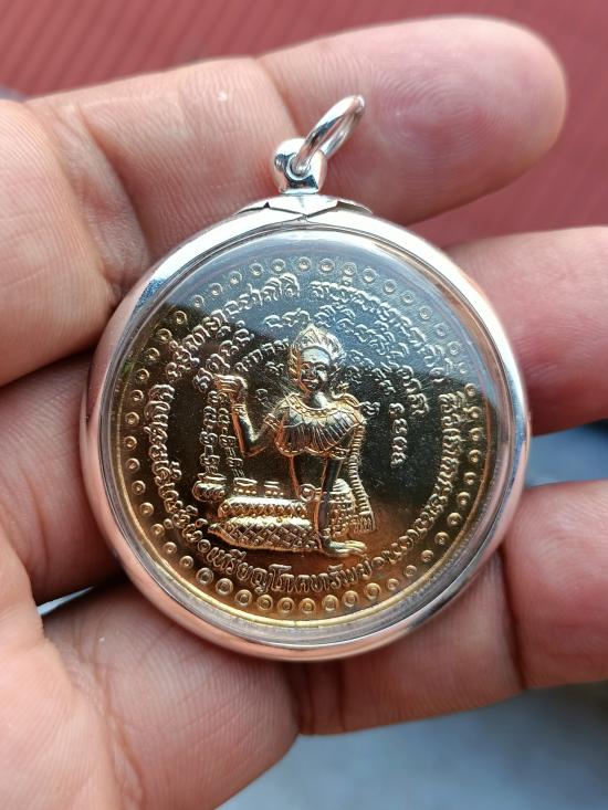เหรียญโภคทรัพย์ วัดศรีประจันตคาม ปราจีนบุรี เนื้อกะไหล่ทอง ปี 2517 เลี่ยมกรอบเงินผ่าหวาย |