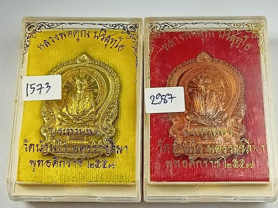 (จัดชุดคู่) เหรียญนั่งพาน "ประทานพร" หลวงพ่อคูณ วัดบ้านไร่ ปี57 เนื้อทองระฆัง+ทองแดงผิวไฟ เบอร์ 1573+2987 พร้อมกล่องเดิมครับ (เหรียญจริงสวย)