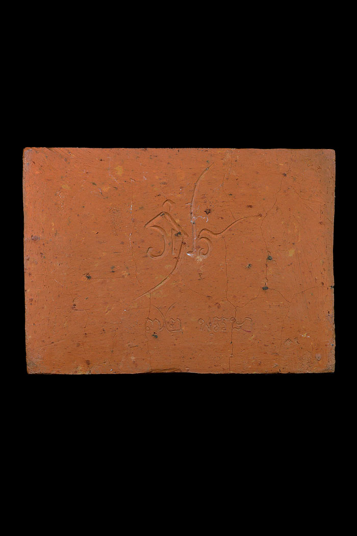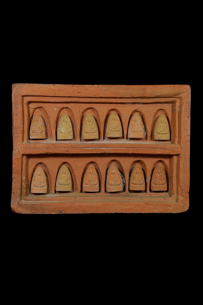 | แผ่นขนาดบูชา 72 พรรษา ( 5 x 7 นิ้ว ) เนื้อดินเผาด่านเกวียน พ .ศ.2537 ( ในแผ่นติดรูปเหมือนนั่งยอง รุ่น ลายเซ็น 12 องค์ พ. ศ .2536 , ขอบข้างจารเปียก ยันต์อักขระ ) |