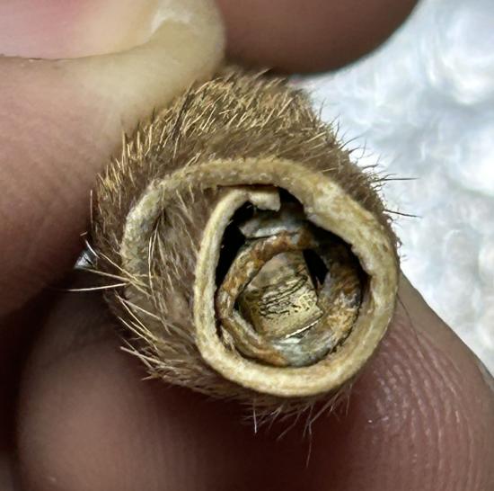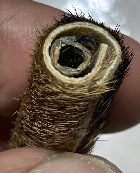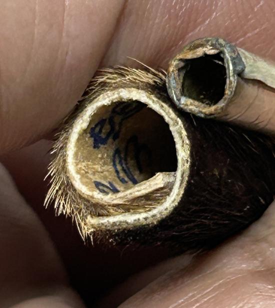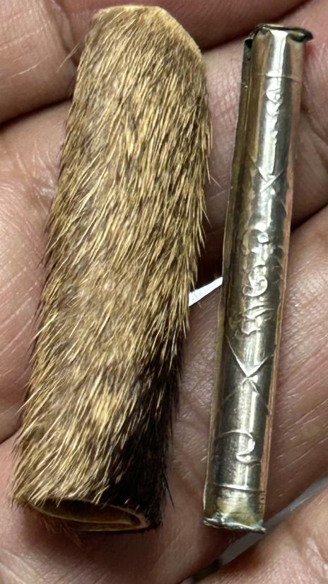 ยาวประมาณ4เซนติเมตร ด้านในมีจารหมึก และมีตะกรุดโลหะอีก2ชั้น