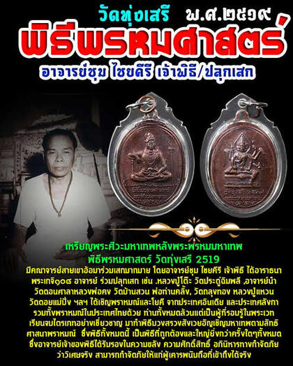 ## เหรียญพระศิวะมหาเทพ หลังพระพรหม...พิธีพรหมศาสตร์ ปี 2519 อาจารย์ชุม ไชยคีรี ออกที่ วัดทุ่งเสรี หัวหมาก พิธีเดียวกับ ศิวะลึงค์ และ มีดหมอ รุ่นแรก ของท่าน พิธีใหญ่มาก พร้อมบัตรรับรอง ....(อ.ชุม ไชยคีรี เจ้าพิธี ได้อาราธนา..พระเกจิ108อาจารย์ ร่วมปลุกเสก เช่น...ลป.โต๊ะ,....อจ.นำ วัดเขาอ้อ...หลวงพ่อคง วัดบ้านสวน .... พ่อท่านคลิ้ง, และพระเกจิสายเขาอ้อ ฯลฯ ร่วมปลุกเสก) ในพิธีนี้ ท่านอาจารย์ชุม ไชยคีรี ได้เชิญพราหมณ์และโยคี จากประเทศอินเดีย และประเทศลังกา รวมทั้งพราหมณ์ในประเทศไทยด้วย....... ท่านทั้งหมดล้วนแต่เป็นผู้ที่รอบรู้ในพระเวทเรียนจบไตรเภทอย่างเชี่ยวชาญ มาทำพิธีบวงสรวงสังเวยอัญเชิญมหาเทพตามลัทธิศาสนาพราหมณ์ ..... ซึ่งพิธีทั้งหมดนี้ เป็นพิธีที่ถูกต้องและใหญ่ยิ่งกว่าครั้งใดๆทั้งหมด...... ซึ่งอาจารย์เจ้าของพิธีได้รับรองในความขลัง ความศักดิ์สิทธิ์ อภินิหารทางกำจัดภัย ว่าวิเศษจริง สามารถกำจัดภัยให้แก่ผู้เคารพนับถือที่เข้าถึงได้จริง