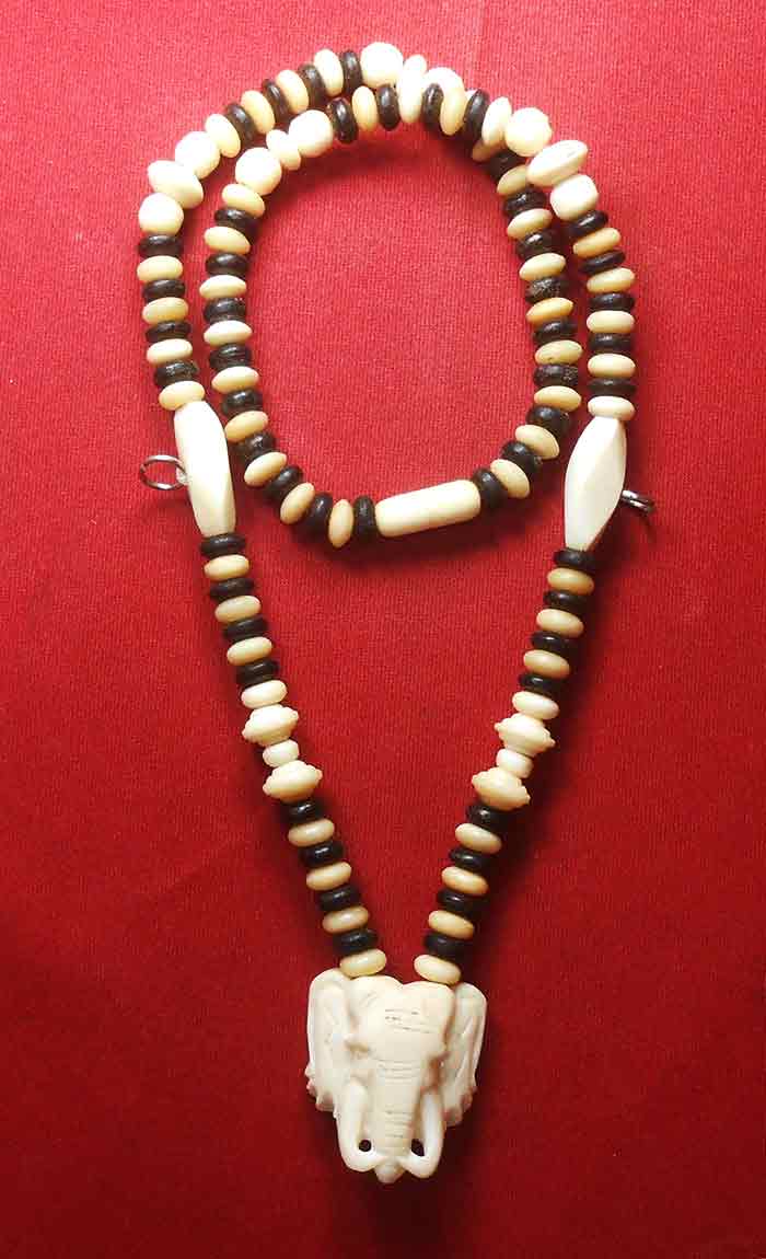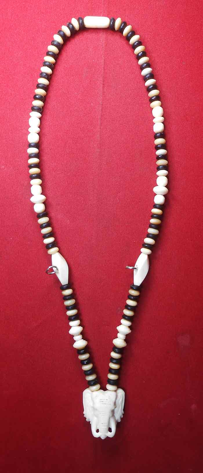 สร้อยหัวช้าง เม็ดกระดูกช้างผสมกะลาเม็ดกะลาตาเดียว ขนาดเส้นผ่าศูนย์กลาง 8.5 ม.ม.หนา 3 ม.ม.ห้อยพระจำนวน 3 องค์ ความยาว 26 นิ้ว